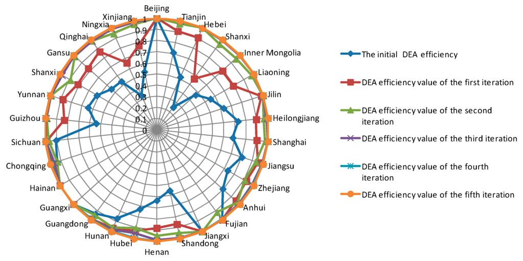 In the next step, the adjusted carbon emission and the consumption of NFFs are used as input variables to calculate the efficiency values of the original DEA model. The average efficiency value of the original DEA model is shown to increase to 0.894, and the efficiency for all provinces and cities has improved significantly from their original state. Compared with the original CO2 emissions, the CO2 emissions in Hebei, Shanxi, Inner Mongolia, Liaoning, Jilin, Heilongjiang, Shandong, Henan, Guizhou, Gansu, Qinghai, Ningxia and Xinjiang have all been reduced, in a total amount of 631,691,800 tons of carbon (t.c.). Meanwhile, another 11 provinces and cities, including Beijing, Tianjin, Shanghai, Jiangsu, Zhejiang and Anhui, have accordingly increased their CO2 emissions by an overall volume of 631,691,800 t.c. The sum of the increased and reduced amounts is zero, guaranteeing the precondition of the fixed total amount. As for another input factor—energy consumption of NFFs—10 provinces and cities, including Tianjin, Hebei, Shanxi and Inner Mongolia, have also reduced their input amount by 158,109,600 t.c.; meanwhile, another 12 provinces and cities, such as Beijing, Liaoning, Jilin and Heilongjiang, have increased their input amount by 158,109,600 t.c., thereby assuring the precondition of fixed total energy consumption. Although the efficiency values of all the provinces and cities have increased following the first iteration, they remain under fair carbon emission allowances. Therefore, another iterative calculation is necessary. After the second iterative adjustment, the average value of the initial DEA efficiency has reached 0.962, with most provinces and cities close to 1. In comparison with the first adjustment, 10 provinces and cities, such as Hebei, Shanxi, Inner Mongolia and Liaoning, continue to reduce their CO2 emissions, whereas another 12 provinces and cities, including Beijing, Tianjin, Shanghai, and Jiangsu, continue to increase their emissions. In terms of NFF consumption, 10 provinces and cities, such as Tianjin, Shanxi and Inner Mongolia, further reduce their consumption, whereas 14 provinces and cities, such as Beijing, Hebei and Liaoning, must increase their consumption accordingly.