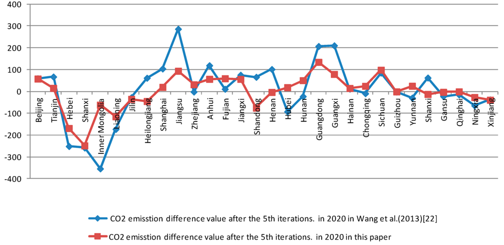 The trend of CO2 emission difference values after the 5th iteration in 2020 between this paper and Wang et al. [22].