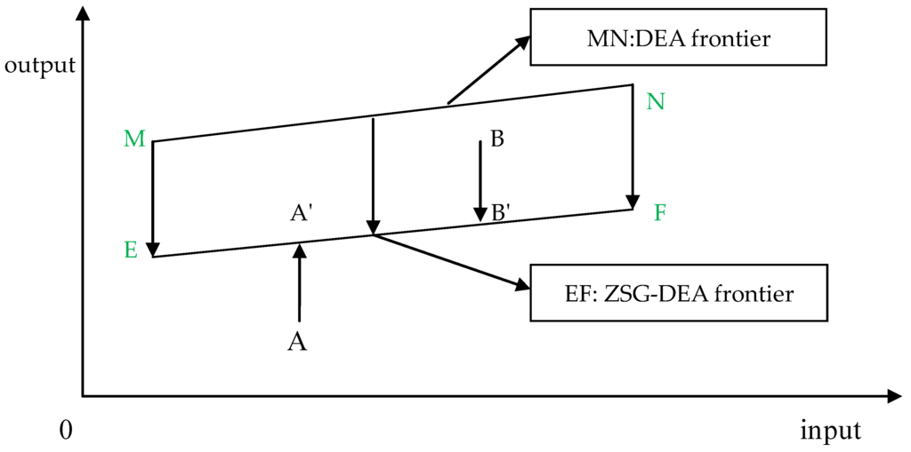 The transmission mechanism from the DEA frontier to the zero sum gains data envelopment analysis (ZSG-DEA) frontier.