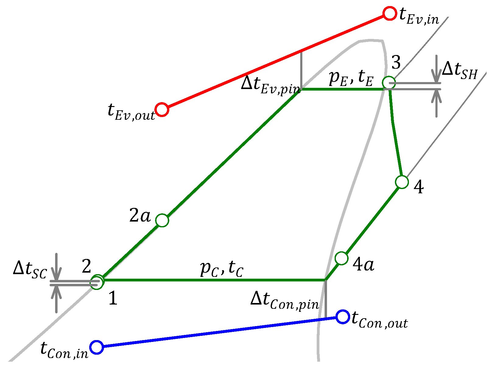 In general, the performance of the ORC can be determined from the thermodynamic cycle (Figure 2). The important parameters of the cycle are condensation pressure () and evaporation pressure (). The condensation pressure is determined by the condenser pinch temperature (). Similarly, the evaporation pressure is determined by the temperature difference at the evaporator pinch point (); however, it must not exceed the maximum pressure which was chosen to be 90% of the critical pressure [17,18]. This limitation can result in operation with a larger than minimum temperature difference at the evaporator pinch point. In this study, the minimum temperature difference for both pinch points was set to 10 C.