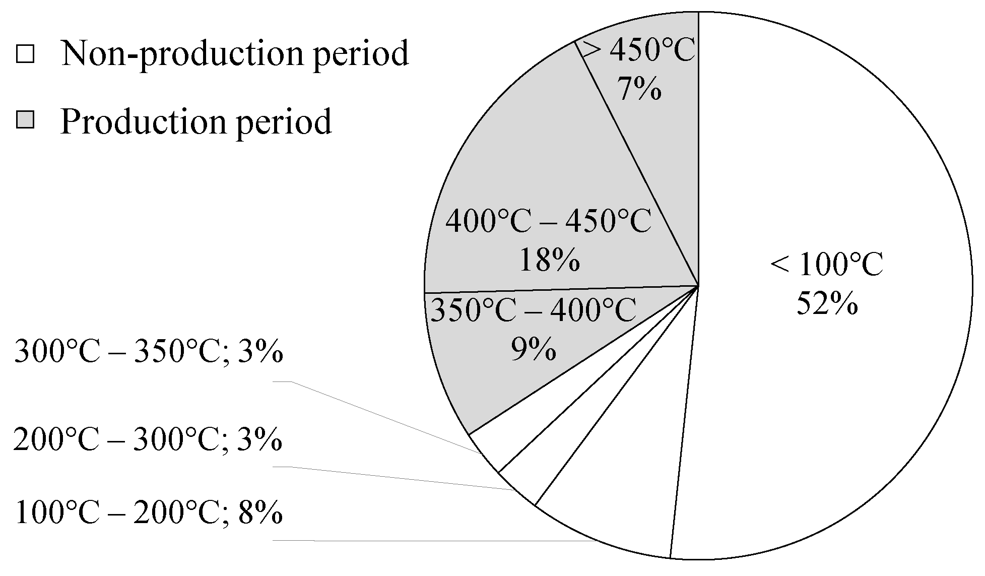 The annual waste heat profile generated for this study is based on 15 weeks of half-hourly data collected between early September and December 2013. Data were collected from the supervisory control and data acquisition (SCADA) system used by the Foundry Company (Rimini, Italy). Waste heat is carried in the exhaust gases that are a product of combustion in a cupola furnace. The initial step in the modelling process was to investigate the distribution of waste heat temperatures. Figure 3 shows that waste heat temperatures were above or equal to 350 C for just over a third of the monitored period. This was during the production period of the process. For more than half of the monitored period, there was no production at all, while the rest of the time was spent on a system preheating and cooling (when temperatures were between 100 and 350 C).