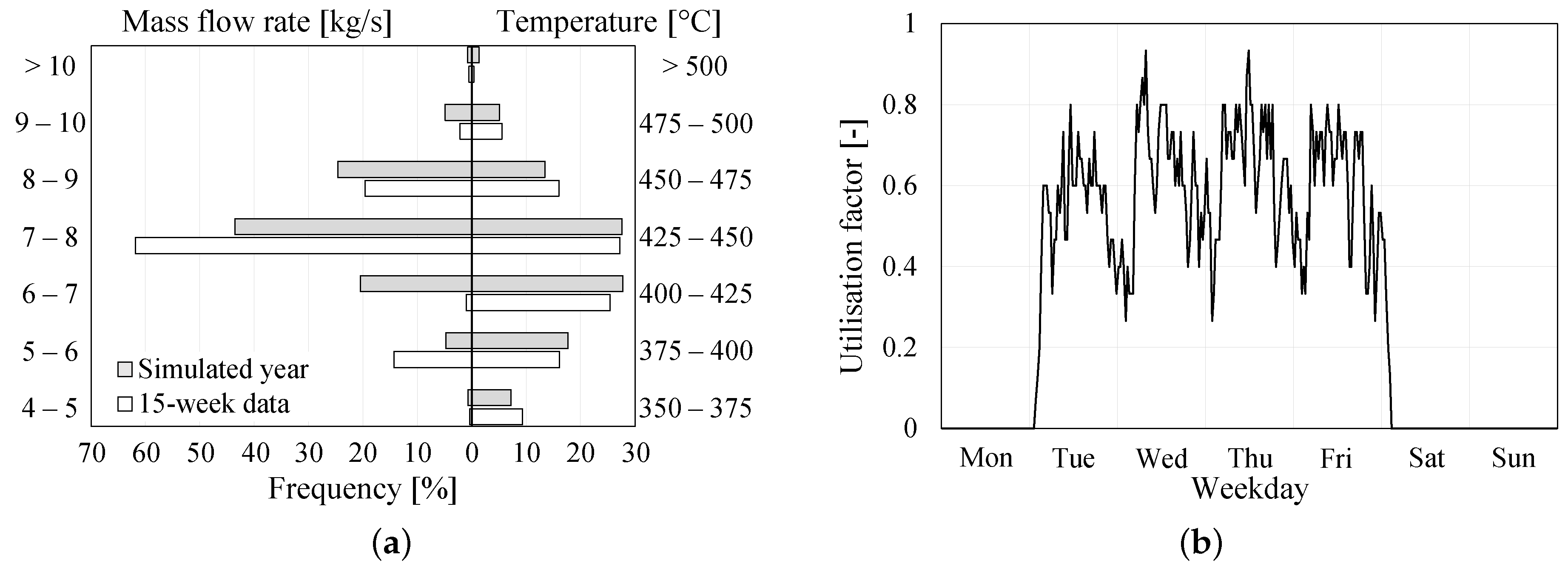 Production period waste heat temperature and mass flow rate frequency distribution in percentiles for both simulated year and 15-week data are presented in Figure 4a. The simulated year data for temperature are a better match for the 15-week data than that for mass flow rate. The reason is that production was reduced for several weeks during the monitoring period and the waste heat flow rate was slightly lower than usual. Another parameter that was obtained from monitored data is the utilisation factor, which shows the presence or absence of production (utilisation = 1 or 0) during each half-hour period over 15 weeks. Figure 4b shows that there was no single half-hour period in which there was production (hence available waste heat) in every one of the monitored 15 weeks. It also shows that there is no production over a weekend or Monday. The utilisation factor is used to adjust ORC electricity generation calculated from the simulated year.
