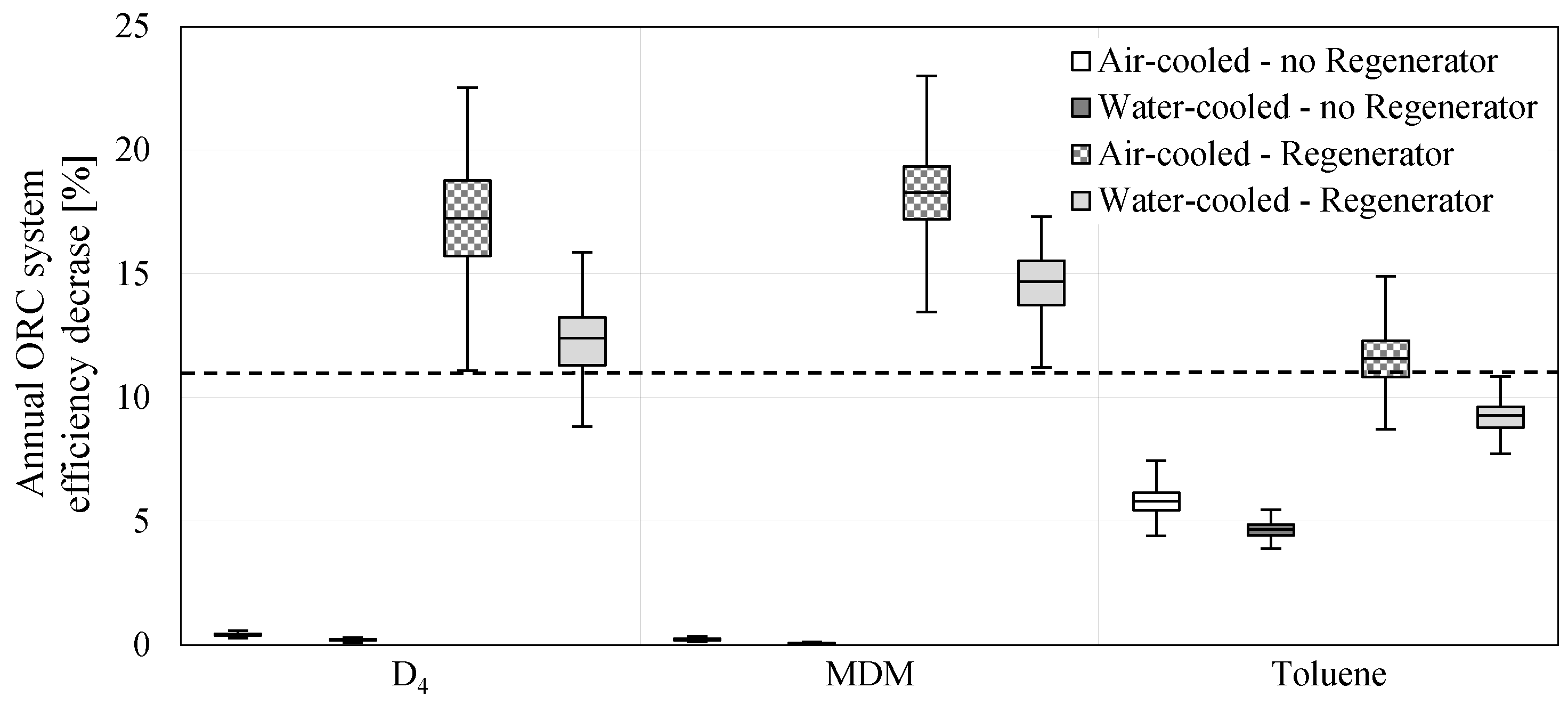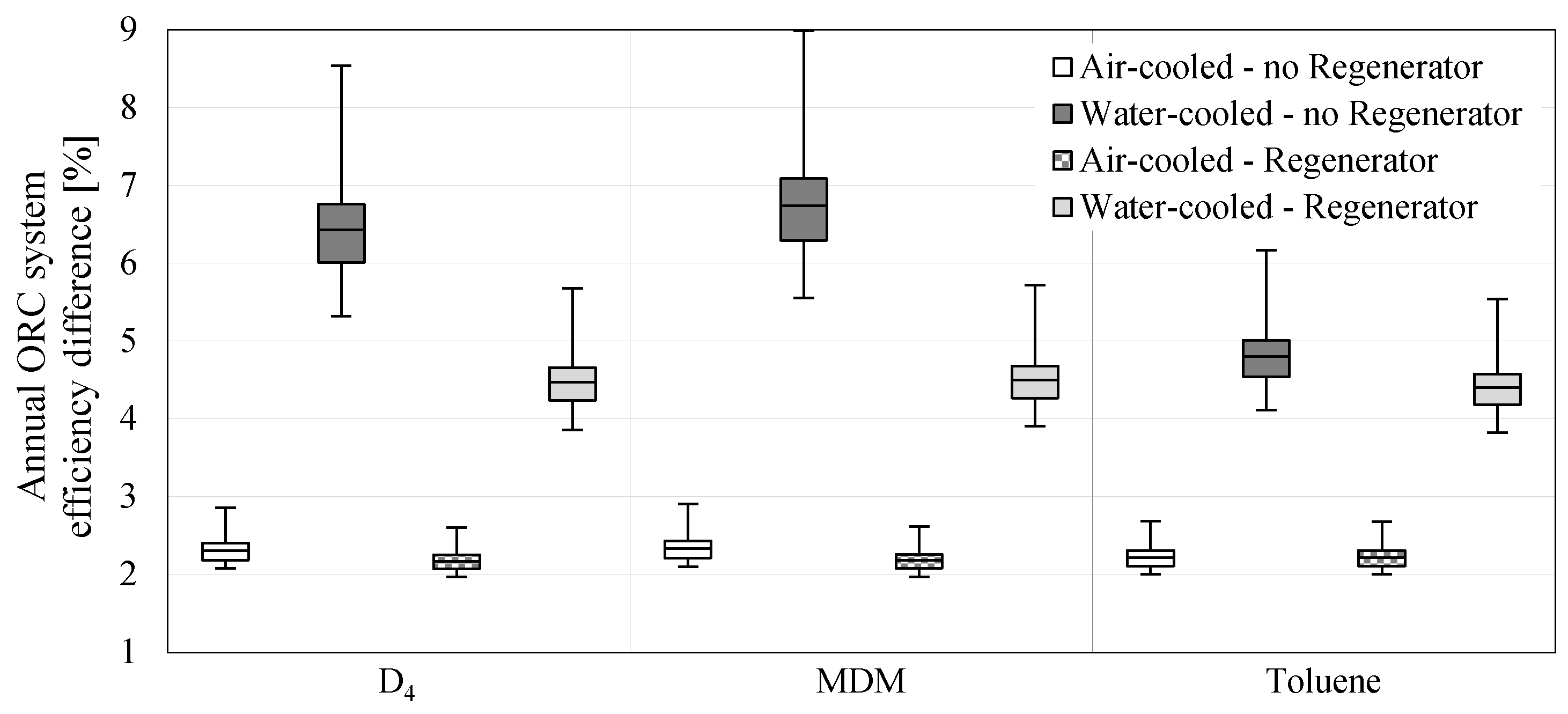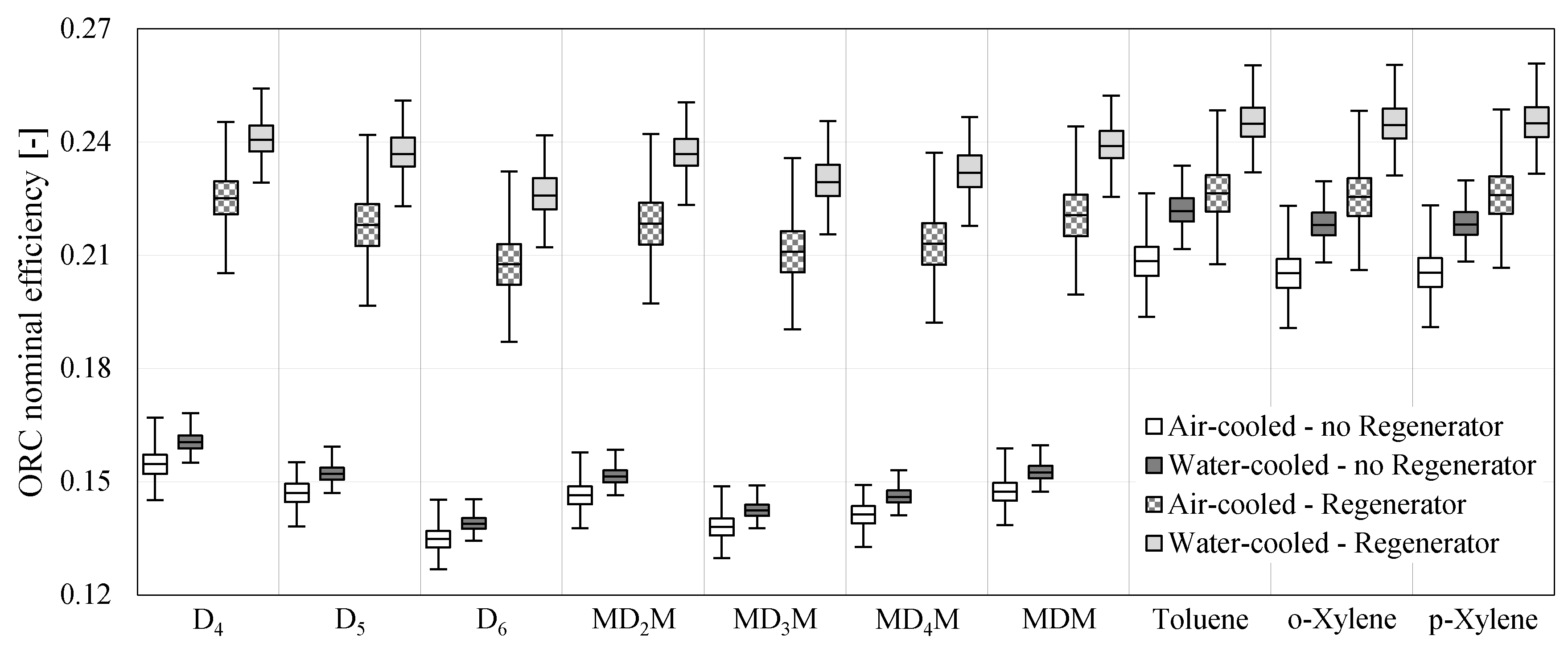 ORC nominal efficiency is evaluated as the thermodynamic cycle performance at nominal operating conditions. Box plots in Figure 7 represent the distribution of ORC nominal efficiencies across 106 European locations for a system with either an air-cooled or water-cooled condenser and with or without a regenerator. It is clear that, for all working fluids, the ORC nominal efficiency is always higher for a system equipped with a water-cooled condenser than the same system with an air-cooled condenser. In addition, using a regenerator results in increased efficiency in all cases. Another clear finding from the results presented in Figure 7 is the large spread of ORC nominal efficiencies for air-cooled systems with a regenerator. The spread is over 4% for aromatic hydrocarbons and up to 4.5% for cyclic siloxanes. The main performance difference between siloxanes and aromatic hydrocarbons is that the latter tend to work better in systems with no regenerator. This may be useful to consider when the preliminary decision on system configuration is made, since regenerator systems are more expensive. The overall conclusion is that aromatic hydrocarbons work better than siloxanes when operated within the system boundaries described earlier. However, within each working fluid group analysed the best performer can be clearly identified only in the case of cyclic siloxanes, where it is D. Among linear siloxanes, MDM and MDM perform similarly. All three aromatic hydrocarbons are very close to each other. Following a detailed inspection of the modelling outputs, Toluene was identified as the working fluid with the best performance across all locations, regardless of the type of condenser or presence or absence of regenerator. These three working fluids are examined in more detail in the following sections.