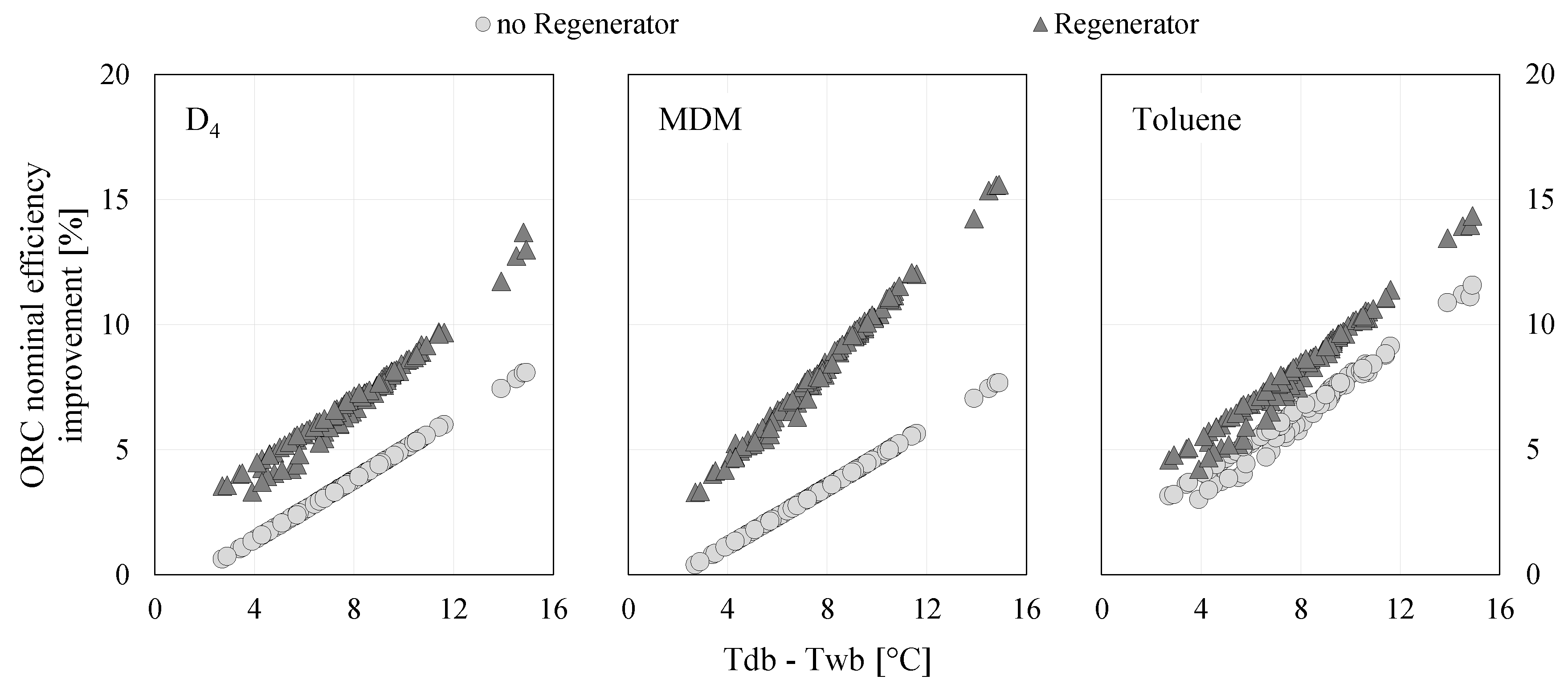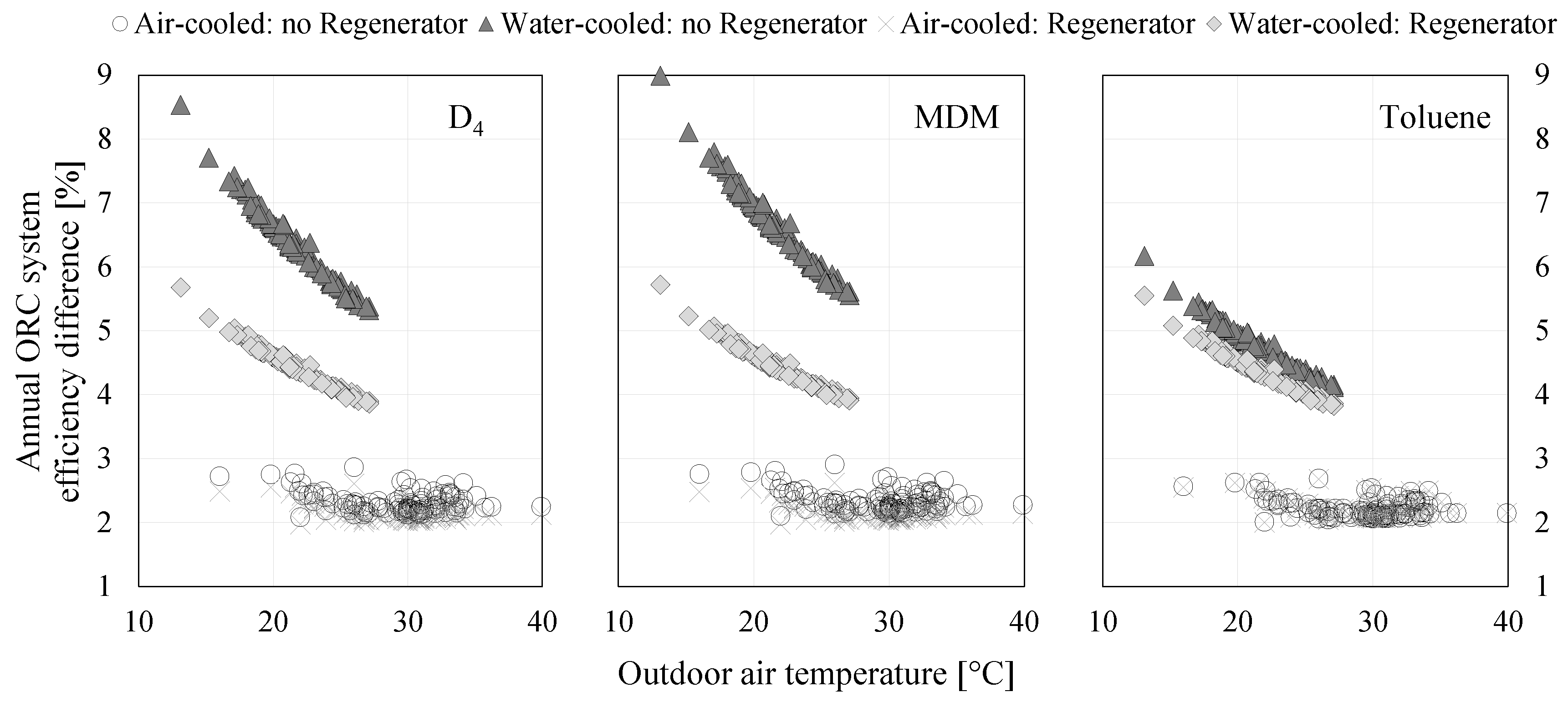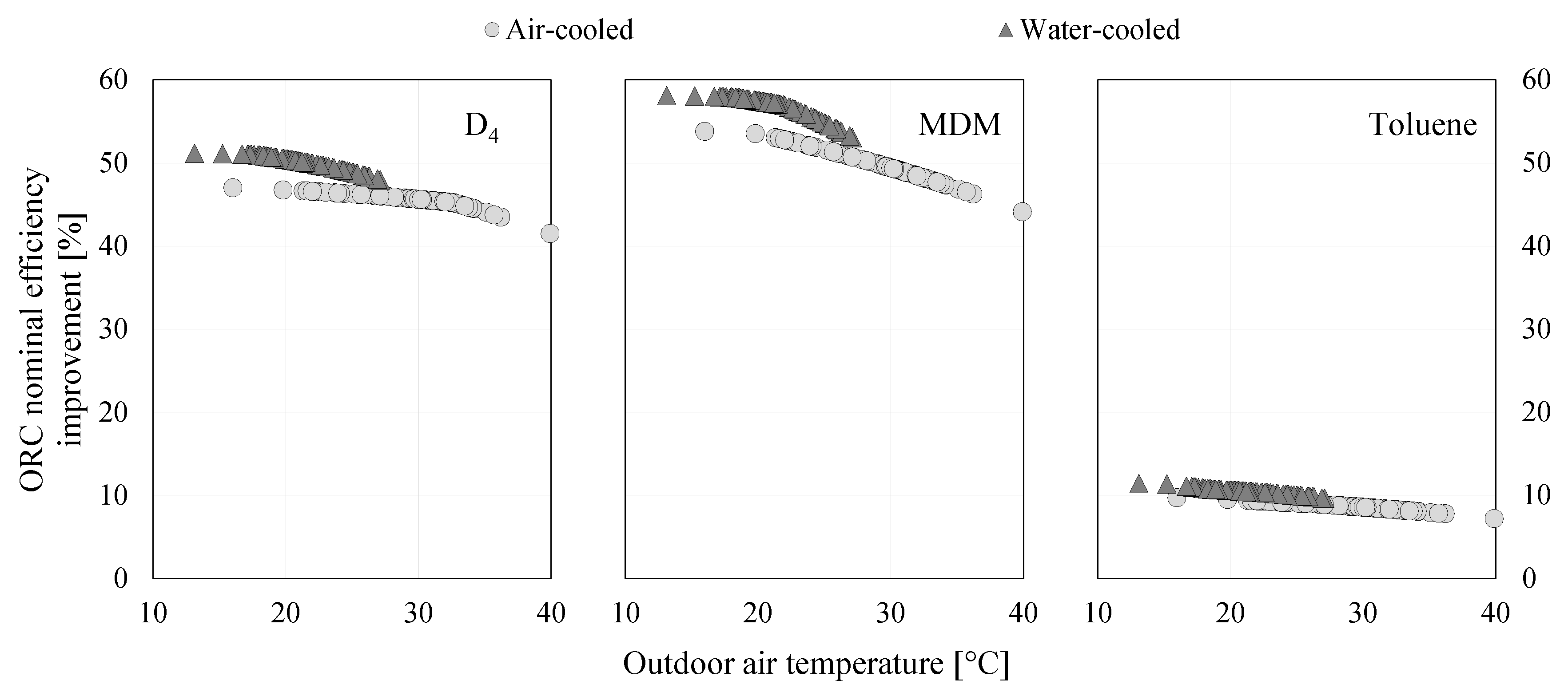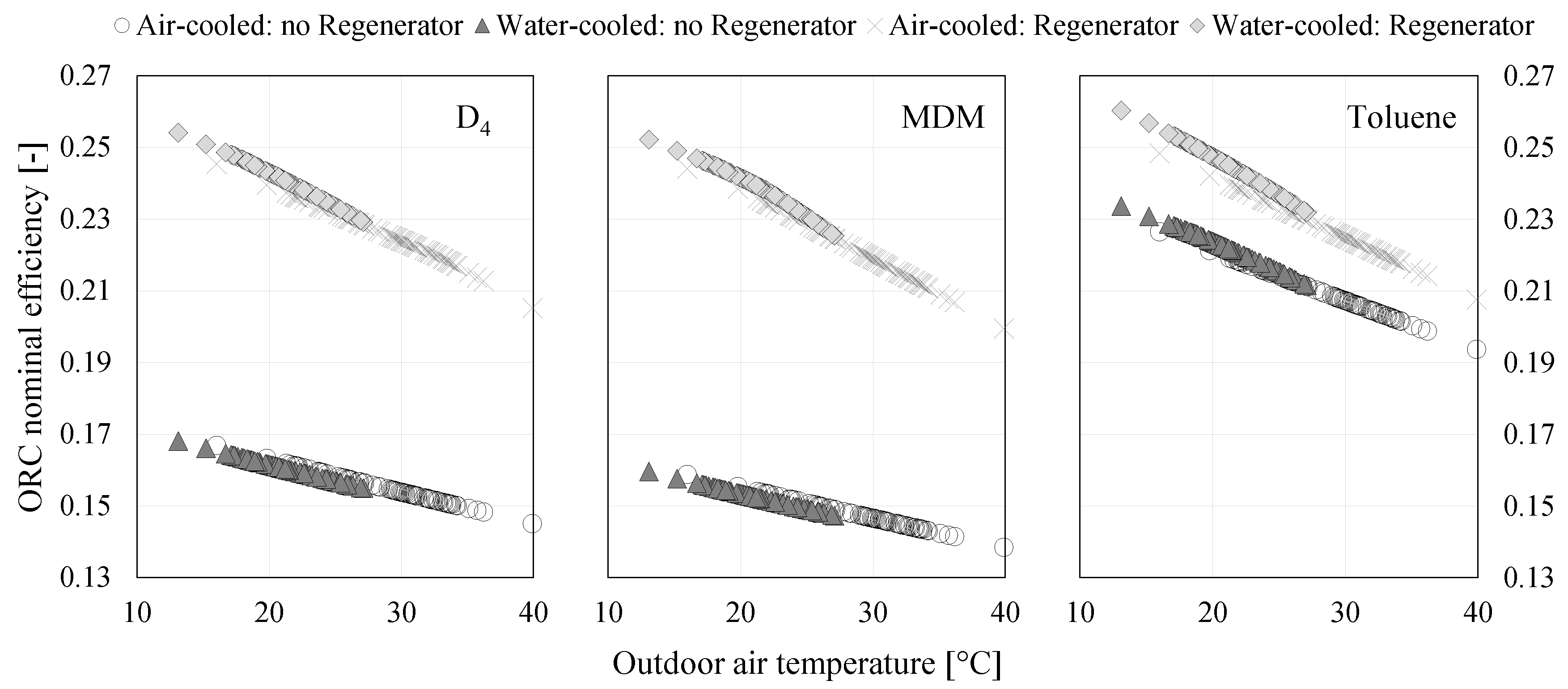 The effect of a regenerator on ORC nominal efficiency is presented in Figure 9. The degree of improvement reduces with outdoor air temperature. In addition, a regenerator brings greater benefits to systems with a water-cooled condenser than to those with an air-cooled condenser. This is particularly notable in systems with siloxanes as a working fluid, where ORC nominal efficiency can be improved by over 50%. However, the benefit of a regenerator is relatively minor for systems with an aromatic hydrocarbon as a working fluid. In such systems, it is particularly important to carry out a cost-benefit analysis to justify the addition of a regenerator due to the increased complexity and capital cost.