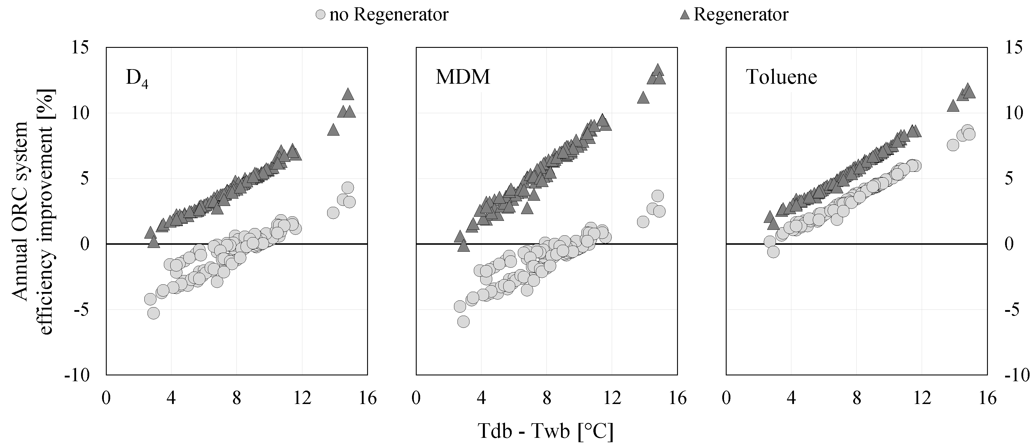 An ORC system with a water-cooled condenser will always have a better nominal efficiency than the same system with an air-cooled condenser, providing we ignore the auxiliary energy consumption, which affects net energy generation. The efficiency difference is larger still for systems equipped with a regenerator at between 3% to over 15% (Figure 10). Systems with siloxanes as a working fluid and no regenerator show only minor improvements in ORC nominal efficiency though water-cooling, although the improvement increases towards 8% as the difference between nominal outdoor air dry-bulb temperature and wet-bulb temperature increases. The difference between these temperatures is an index of humidity and therefore depends on location. More humid locations have a smaller difference, which suggests the selection of the cheaper and simpler air-cooled condenser despite the slightly better performance that a water-cooled condenser would provide.