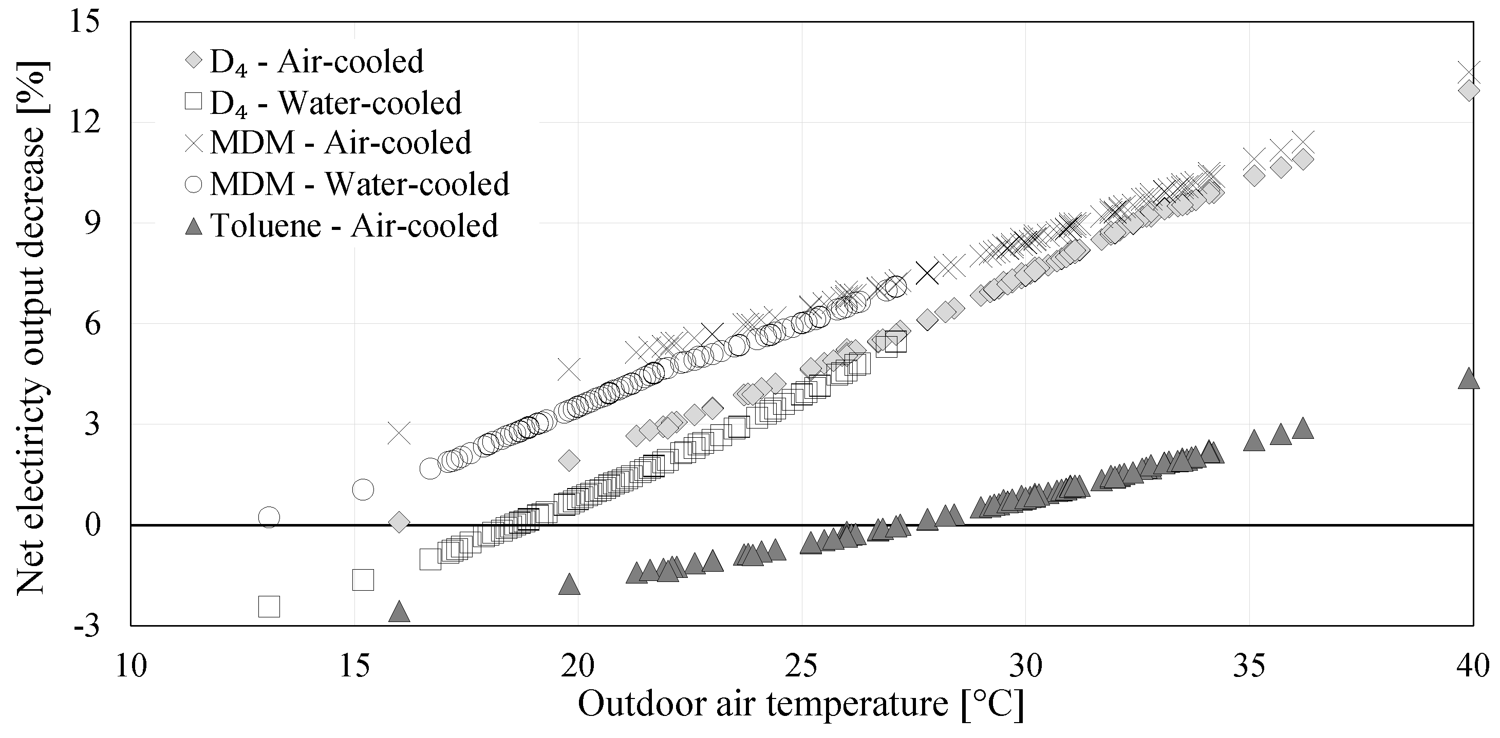 Waste heat input is the same for each location analysed as it is based on a simulated profile developed from monitored data. The most important location-specific parameter affecting ORC nominal efficiency is the condensation pressure, which is directly linked to nominal outdoor air temperature. Figure 8 shows the almost linear trend of ORC efficiency reduction with nominal outdoor temperature (which affects condensation pressure). The horizontal axes in Figure 8 represent nominal outdoor air temperature, which is taken as dry-bulb temperature for systems with an air-cooled condenser and wet-bulb temperature for systems with a water-cooled condenser.