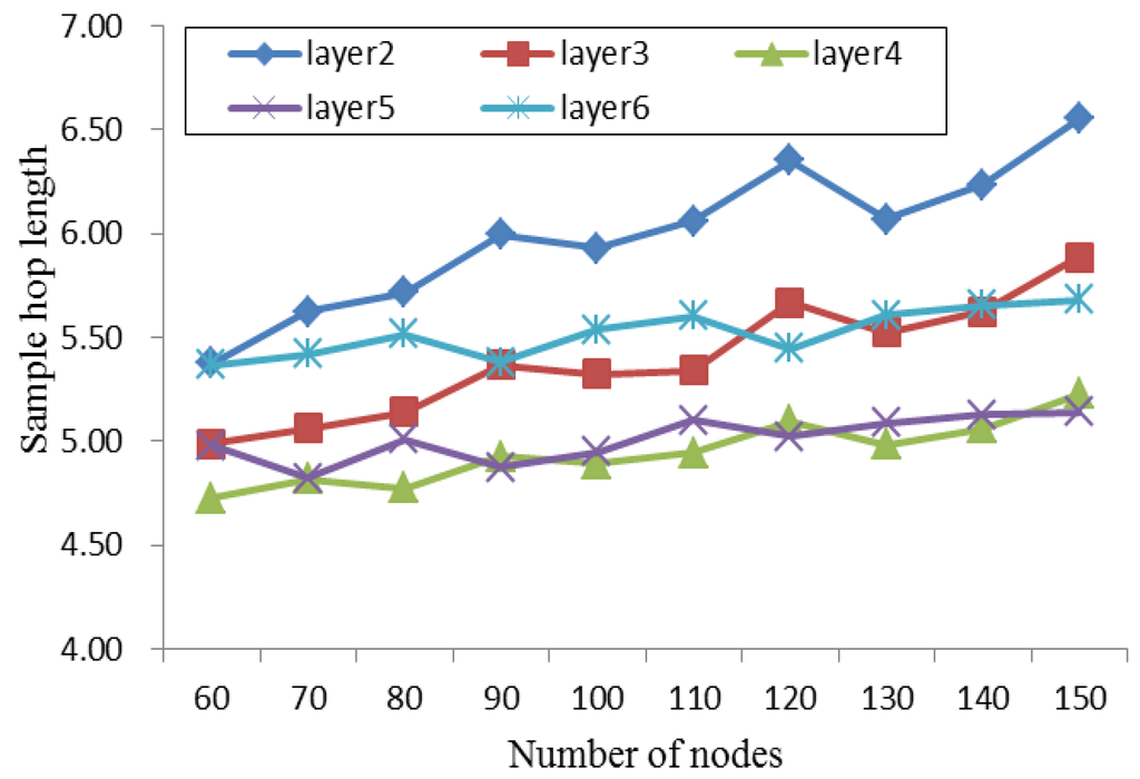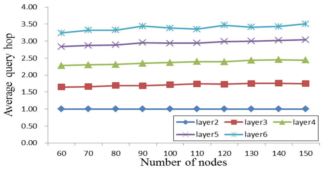 where m is the number of nodes in the mesh-shaped subnet, and is the query hop of each node m. This parameter can be regarded as the maintenance cost in the mesh-shaped topology. The average query hop length increases as the k layer increases, as shown in Figure 5.