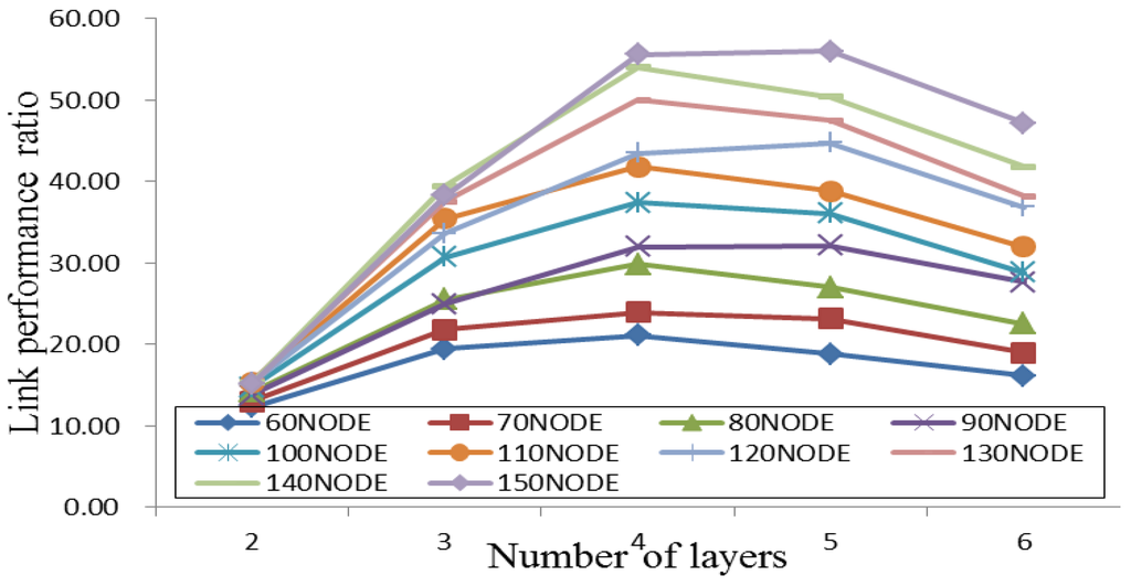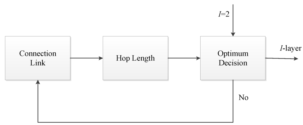 Initially, I is set as two and the PI is calculated. Then the I = I + 1 for the connection link block and PI+1 are computed in the optimum decision block. When PI+1 > PI, the optimum decision block increases I by one and triggers the connection link block again. The link performance ratio of Layer I + 1 is computed until PI+1 < PI and the decision is made. As a result, I is regarded as the optimum number of layers, and the algorithm is stopped.