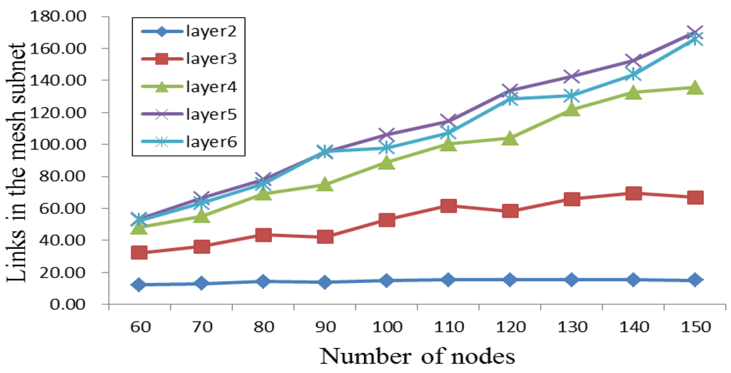where m is the number of nodes in the mesh-shaped subnet, is the number of return links and is the number of tree links for each node m. Figure 4 shows the total number of links in the mesh-shaped topology for various network sizes. The total number of links in the mesh-shaped subnet increase as the number of layers k increases, except for the k = 6 case, since it is more difficult for this case to satisfy the return condition, as compared with the other cases.