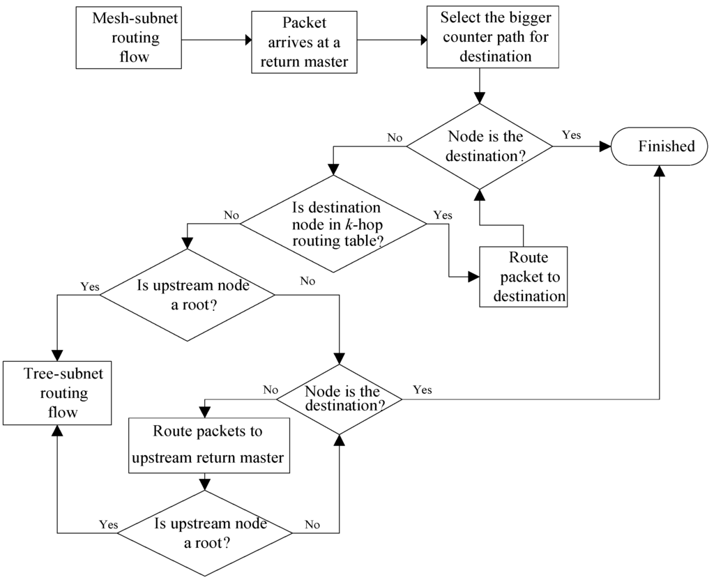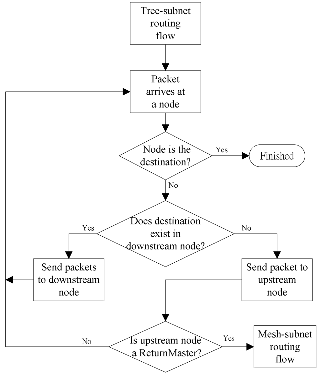 Within a tree-subnet, the routing algorithm for packet transmission is as follows: When any node starts to transmit packets or receive routing packets, it examines its routing information first. If a destination is contained in its routing table, a packet is delivered to the corresponding downstream node. Otherwise, this packet is forwarded to its upstream master. Since the new root possesses the complete spanning tree-subnet routing information, a packet will eventually reach the destination node or pass to the mesh-subnet. The detailed operation diagram of tree-subnet routing is shown in Figure 8.
