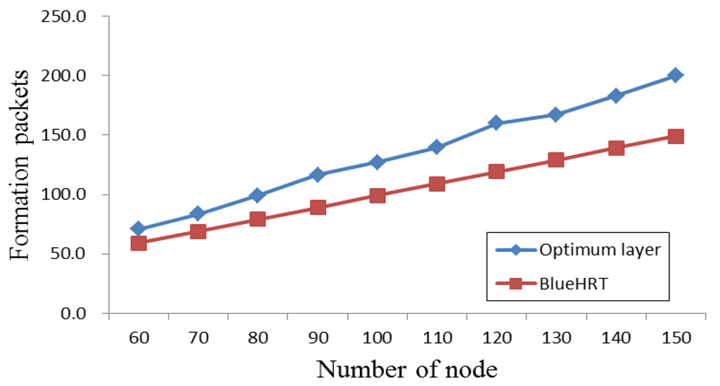 As shown in Figure 10, the reconfigurable mesh-tree required more formation packets in terms of energy cost than BlueHRT did. The formation packets are counted as the total number of communication packets in the mesh-subnet and the formation packets of all the other tree subnets. However, this formation packet overhead was only generated during the scatternet formation phase.