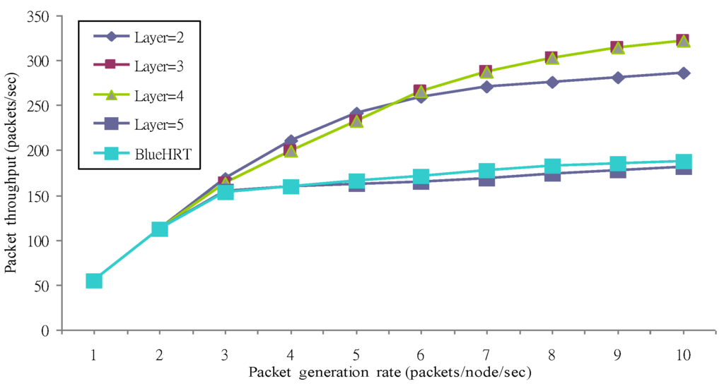 In a mesh-tree topology, the average packet throughput increases continuously as the routing packet generation rate increases. In general, the mesh-tree has much better throughput performance than BlueHRT in layer k = 2, 3 and 4 cases. This is because the hierarchical routing method, together with the mesh-subnet, significantly enhances the system performance. From the observation of the simulation, the throughput increases as the size of the mesh subnet increases. When the packet generation rate is greater than six, the k = 3 and 4 cases achieve better throughput performance than the k = 2 case since they generate more return links to increase the size of the mesh-subnet. In addition, the k = 5 case achieves the worst throughput performance as BlueHRT since this case almost achieves the tree structure and is not suitable for the reconfigurable mesh-tree network.