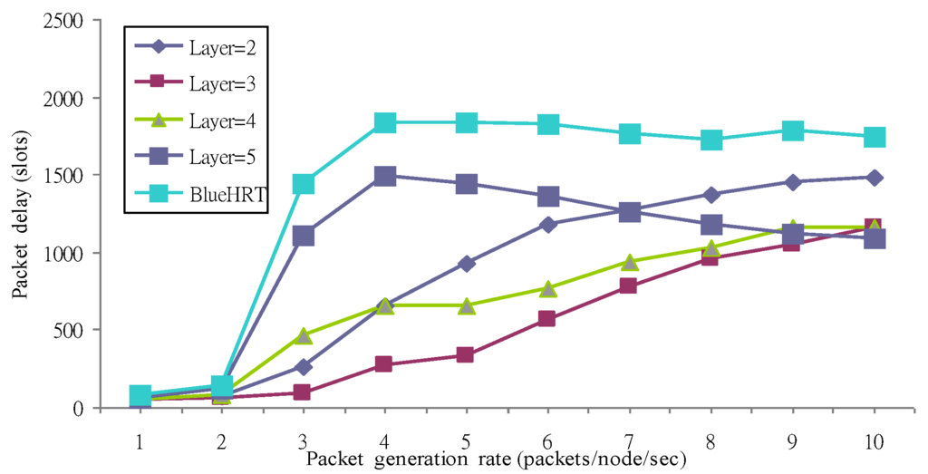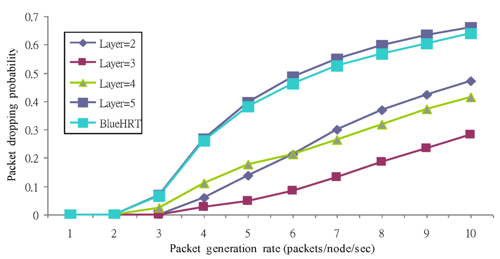 From the simulation results in Figure 13, the layer = 5 case achieves the worst performance on the packet dropping probability. From the observation of our simulation, the longer the delay packets were dropped and the average packet delay decreases as the packet generation rate is greater than four in Figure 12.