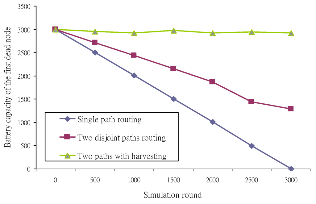 In terms of energy efficiency, the network lifetime is defined as the time taken for the first node to deplete its battery capacity in the mesh-subnet. From the simulation, the first dead node is located around the sink node, and three simulation cases were generated for this hot-spot node. In Figure 14, the conventional shortest path case with single path routing depletes its battery capacity first. The two disjoint paths routing case improves the energy efficiency in terms of network lifetime by about 43% over that of the conventional shortest path case. With energy harvesting, the two paths routing algorithm achieves the best network lifetime performance, since the rechargeable batteries effectively improve the power consumption for packet transmission.