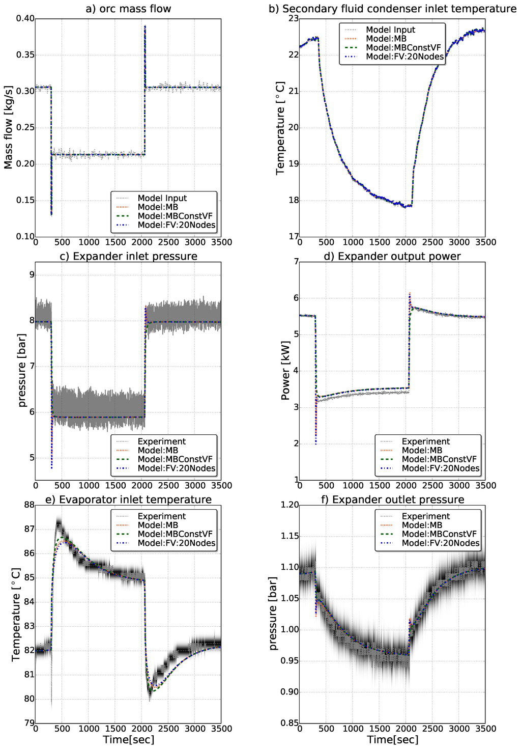 - The comparison against experimental transients of a small 11 kWel ORC power unit demonstrates that both the FV and the MB with an analytically calculated void fraction approaches are suitable for the dynamic modeling of the evaporator when integrated at the system level. The moving boundary model allows one to decrease significantly the simulation speed while keeping a good accuracy with the experimental data.