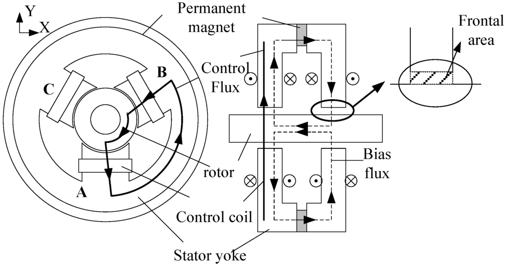 Figure 1 shows the configuration and flux path of the three-pole radial HMB. In Figure 1, it can be seen that the three-pole radial HMB has two symmetrical stators. Each stator has three poles, and the three poles are uniformly spaced at 120° intervals. The two symmetrical coils are connected in series to form a phase, and three phases are in a star connection. A ring-shape permanent magnet connects two stators. An axial magnetized permanent magnet ring provides bias flux flows through stators, air gaps and rotor, as shown by the dashed lines. Bias flux produces magnetic forces to suspend the rotor at the equilibrium position without disturbances and gravity. The control coils supply control flux as the solid line shows. When the input current is positive, the control flux strengthens the bias flux so that the electromagnetic force becomes stronger (biased magnetic forces and control magnetic force are collectively called electromagnetic force in the following context). When the input current is negative, the control flux weakens the bias flux so that the electromagnetic force becomes weaker. Electromagnetic forces from three poles cooperate to stabilize the rotor. There is no coupling between the control flux and bias flux due to the different flux paths. In order to facilitate the description, the three poles are marked as A, B and C.