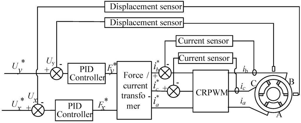 The radial position signals of the rotor are differentially detected by eddy current displacement sensors. Then, the differential signals are compared with the reference values. Through the signal processing circuit, the difference is transferred to PID controller to obtain signals representing the forces. The controller transforms force signals into three phase current signals by force-current transformation and 2/3 coordinate transformation. Then, the three phase currents are taken as reference currents and compared with the input currents of the electromagnets. The input currents are detected by eddy current sensors. Then, the PWM signals are obtained and used to activate the three-phase power inverter. Furthermore, the desired currents can be generated and the desired suspension forces can be produced.