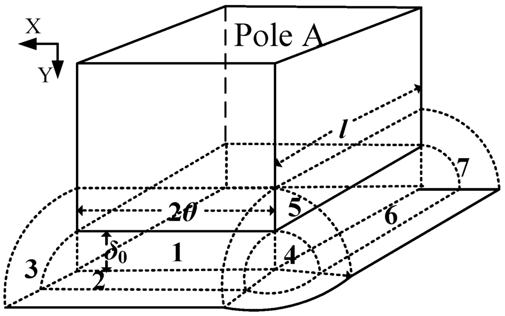 In Figure 4, pole A is taken as an example to show the flux distribution of the edge effect. The dashed lines, which actually do not exist, are used to distinguish different edge sub-regions. In this three-dimensional figure, it can be seen that edge flux is distributed symmetrically with regard to the pole centre. According to the magnetic field division method [26], the flux around the pole is divided into seven sub-regions (asymmetrical parts are not involved in calculation). As Figure 4 shows, region 1 represents the frontal region of the pole, whose permeance is G1; regions 2 and 6, whose permeance are G2 and G6, are shaped like a quarter of a cylinder; regions 3 and 7 are the same as a quarter of a hollow cylinder, whose permeance are G3 and G7; region 4 is 1/8 of the sphere, whose permeance is G4 and region 5 is 1/8 of the hollow sphere, whose permeance is G5.