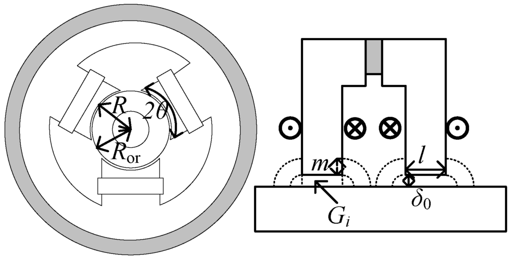 Figure 6 shows dimensions of the HMB, which are needed in the calculation of the permeance of air gaps. R is the length between the center of rotor and the frontal face of pole; Ror is the outer radius of the rotor; 2θ is the arc length of the single pole; δ0 is the length of air gaps without eccentricity; l is the axial length of the pole and m is the radial length considering the edge effect distribution. Here, m = 2δ0.