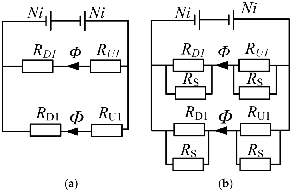 (a) Common equivalent magnetic circuit. (b) Equivalent magnetic circuit considering the edge effect.