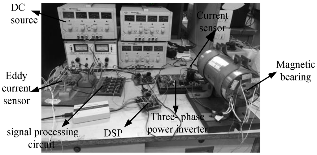 The experimental system comprises a controller module, a sensor module, a three-phase power inverter module and the three-pole radial HMB. The controller is operating on a TMS320F2812 digital signal processor (TI Inc.: Dallas, TX, USA). Sensor module include an eddy current displacement sensors and current sensors. The control process has been depicted in Section 2 in detail. Figure 8 shows the experimental rig.