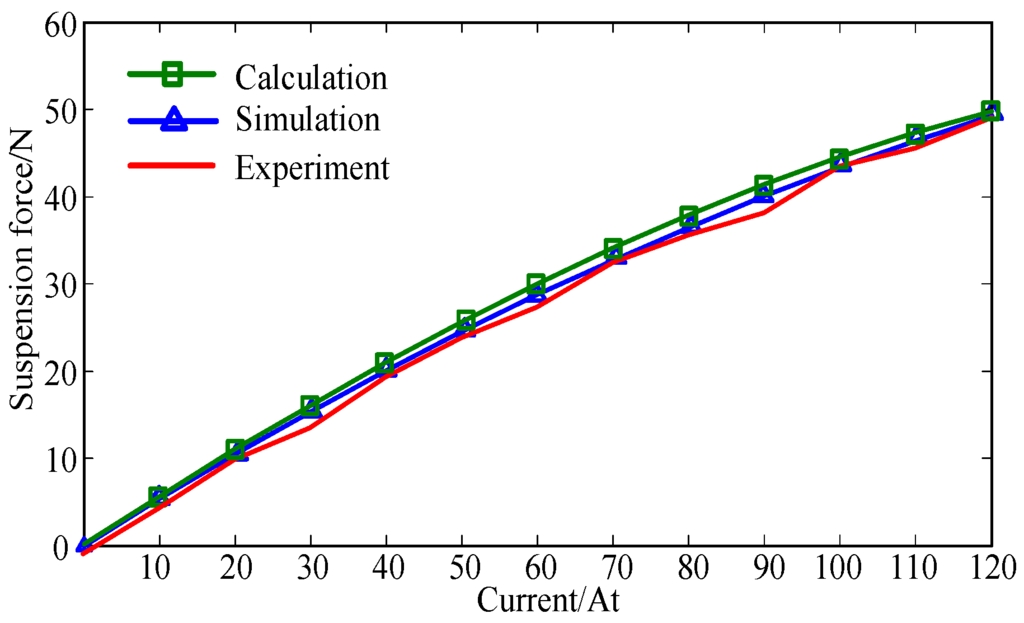 Due to the nonlinearity of the three-pole radial HMB, the rotor is limited to operating around the equilibrium position so that the calculation values can match the experiment values. In the three-pole radial HMB, the air gap flux density provided by the permanent magnet ring is 0.45 T. The stator and rotor are made of silicon steel sheets. The flux knee of the BH curve of silicon steel sheet is about 1.5 T. In the design process of the three-pole radial HMB, the maximum flux density of air gap is chosen as 0.9 T, which is far lower than 1.5 T. Therefore, the designed magnetic bearing can work in a relatively linear way, and flux saturation cannot be the reason for any discrepancy between the experimental data and calculated data.