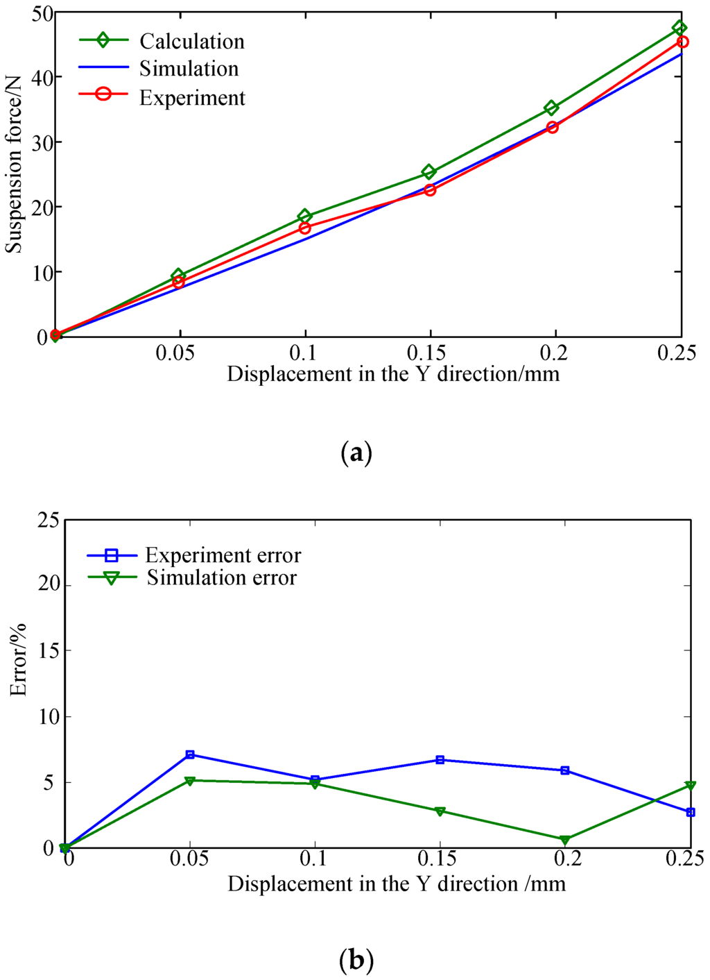 (a) Suspension force related to eccentricity along the Y-axis (b) Error comparison between experiment and simulation