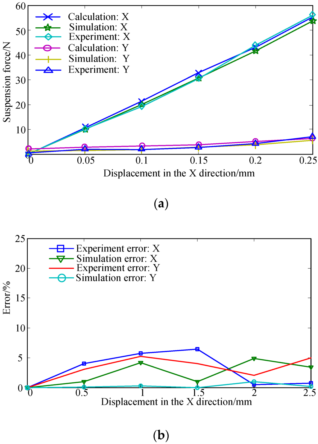 (a) Suspension force related to eccentricity along the X-axis (b) Error comparison between experiment and simulation