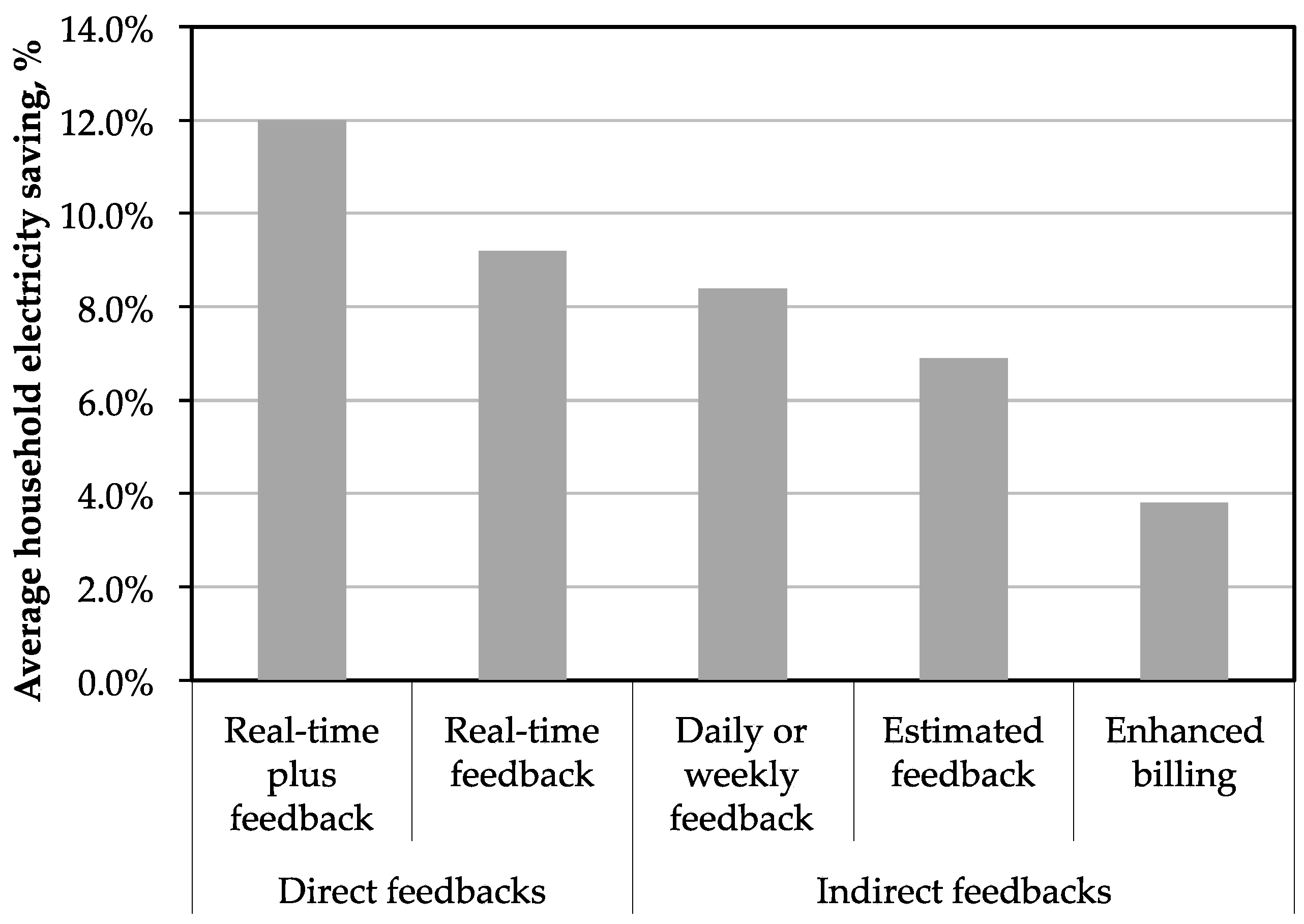 These factors need to be considered when tailoring the data that should be provided to end-users [44,45]. Collected data can be shown to users as: (i) direct feedbacks, which are the representation of the collected data typically provided in real-time; and/or (ii) indirect feedbacks, which are derived from a post-processing task and provided after the energy usage has occurred. Direct feedbacks are: real-time plus feedback (i.e., real-time information about the level of energy used by the appliance), real-time feedback (i.e., real-time premise level information), while indirect feedbacks are daily or weekly feedback, which is that are household-specific information and advice on a daily or weekly basis, estimated feedback (i.e., typically web-based energy audits with information supplied on an on-going basis), and enhanced billing (i.e., household-specific information and advice) [42]. Figure 1 shows the percentages of annual household electricity savings based on 36 studies implemented between 1995 and 2010 [42].