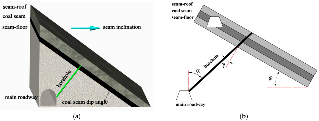 Diagram showing the relative positions of a hydraulic fracture borehole and a coal seam. (a) Graph showing a 3D view of hydraulic fracture; (b) graph showing a profile view of hydraulic fracture borehole from the seam inclination direction.