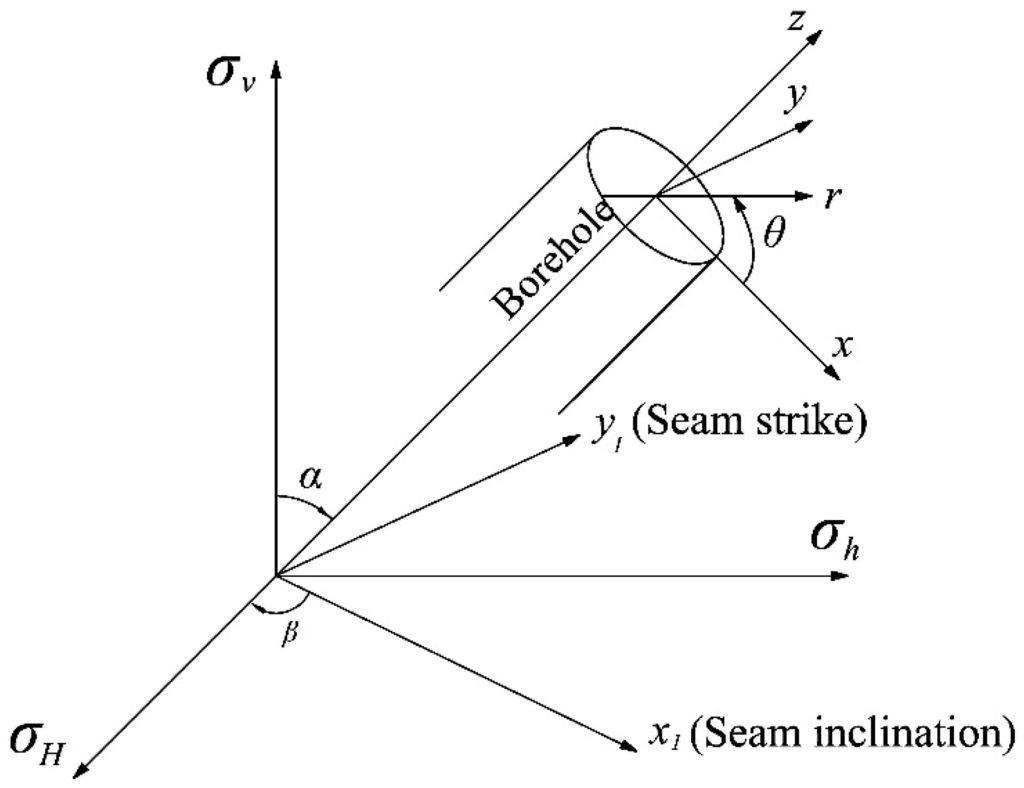 There are two locations where fractures are initiated when performing cross-measure HF. One is in the coal seam, the other is in the coal-rock interface. There are essential differences between the mechanisms that control fracture initiation at these two locations. The following sections present a mathematical analysis of the two initiation locations. In order to simplify the analysis, in the mathematical model the coal and rock near borehole will be considered to be homogeneous elastic bodies [18,19,20,21]. In addition, the filtration effect of the layers and the changes in pore water pressure will not be taken into account in the modeling.