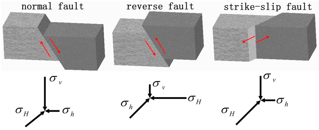 Generally, in situ rock stress is a combination of stress from the overlying strata due to gravity and tectonic stresses. The vertical principal stress is in almost all cases relatively constant. However, the horizontal maximum and minimum stresses show great variability near different kinds of faults. Normal faults, reverse faults, and strike-slip faults have different principle stress states, as shown in Figure 3.