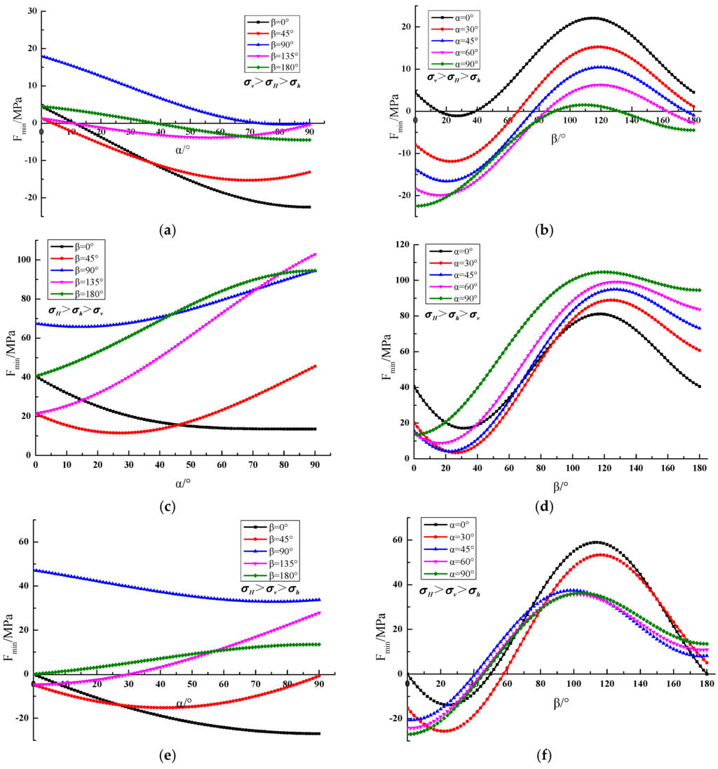 According to the statistics on the stress state in the shallow crust in China reported by Jing et al. [22], the three principle stresses conform to the rules shown in Equation (8). Based on the assumptions above, the variation of Fmin can be computed using MATLAB R2013a software (MathWorks Inc., Natick, MA, USA), for α = 0°, 30°, 45°, 60°, and 90° and β = 0°, 45°, 90°, 135°, and 180°.