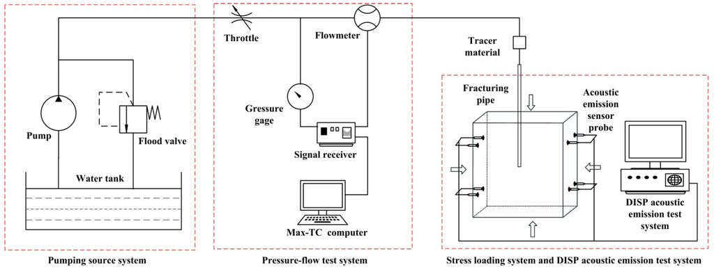 In order to verify the validity of the initiation location determination criteria for different coal seams, we conducted some tests in the laboratory. These tests were similar to typical HF tests for coal seams. The purpose of the tests was to obtain the relationship between the actual crack pressure and the initiation location of the crack in relation to the dip of the coal seam. The tests used a three-axis HF simulation test system made up of four main parts: the pump system, the pressure flow system, stress loading system, and DISP acoustic emission test system. The pump system uses a 31.5 L/min, 20 MPa high-pressure water pump, the pressure flow measurement system is composed of a 500 kN electrohydraulic servo three axis test machine, an electromagnetic flowmeter, and a signal receiving apparatus, and the stress loading system uses self-designed hydraulic pressure loading devices. System connections are shown in Figure 5.