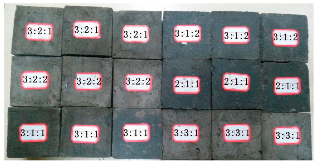 Test samples were manufactured to resemble coal and rock from the Tonghua coal mine in the Songzao Mining Area, Chongqing, China. In order to decide on the appropriate mix of constituents for the samples, six sets of preliminary samples were prepared to compare their compressive strength to that of samples collected in the field [23,24]. The test samples, 7 cm cubes as shown in Figure 6, were prepared according to Chinese national standards in procedures for “Method for determining the physical and mechanical properties of coal and rock” (GB/T23561.1-2009) and “Standard for test method of basic properties of construction mortar” (JGJ/T70-2009). Strength tests were performed using an AG-I electronic precision material testing machine. Based on the results of those tests, a ratio of cement: river sand of 1:6.38 was chosen for the simulated rock material and a coal: cement: gypsum ratio of 3:1:1 was deemed most appropriate for the simulated coal material. The test results are shown in Table 1.
