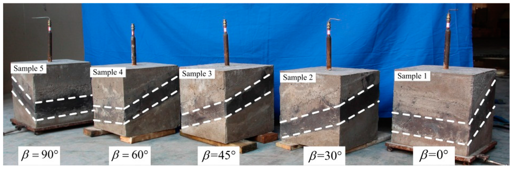 The specimens are made in a 300 mm × 300 mm × 300 mm die. By changing the height of the four pivot points of the die to control the coal rock strata. After mixing the material with water, it is placed in the die in order by layer using a steel rule to measure and control the thickness of the coal seam. The fracturing pipe to connect with hydraulic line is set into the specimen and 110 mm long by 3 mm diameter hole simulation fractures are drilled at the lower end of the fracturing pipe. It is very important to cement the samples at the interface during the test. In order to avoid the presence of strength defects in the coal-rock interface, the die should be shaken many times to prevent natural fractures existing in the coal-rock interface. Natural fractures in the coal seam would influence the initiation location of the crack. After the specimen is made, the relationship between the fracture tube and the stress loading position cannot be changed (α = 0°). All samples were made with = 20° and β = 0°, 30°, 45°, 60°, 90°, as shown in Figure 7.