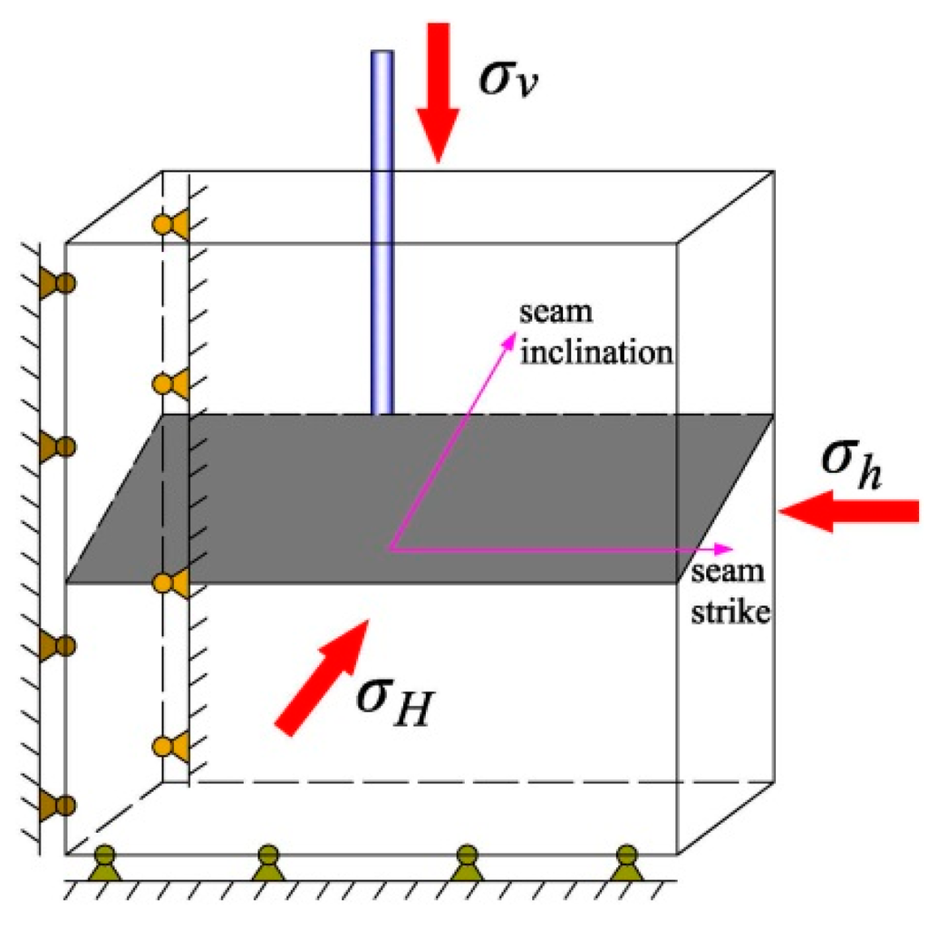 - Lin, H.X.; Du, C.Z. Experimental research on the quasi three-axis hydraulic fracturing of coal. J. China Coal Soc. 2011, 36, 1801–1805. (In Chinese) [Google Scholar]