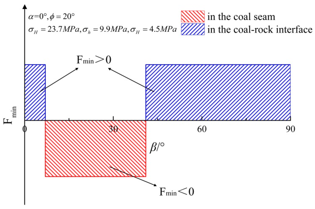 Considering the physical meaning of Fmin, Figure 4a shows that with the angle between the borehole axis and the vertical increasing near a normal fault, Fmin mainly decreases. This means that the initiation location tends to be in the coal-rock interface. Figure 4c shows that Fmin mainly increases near reverse faults, therefore the initiation location tends to be in the coal seam. Figure 4e shows that Fmin does not have a specific variation tendency near strike-slip faults, therefore the initiation location is determined by the value of α for that particular drill hole.