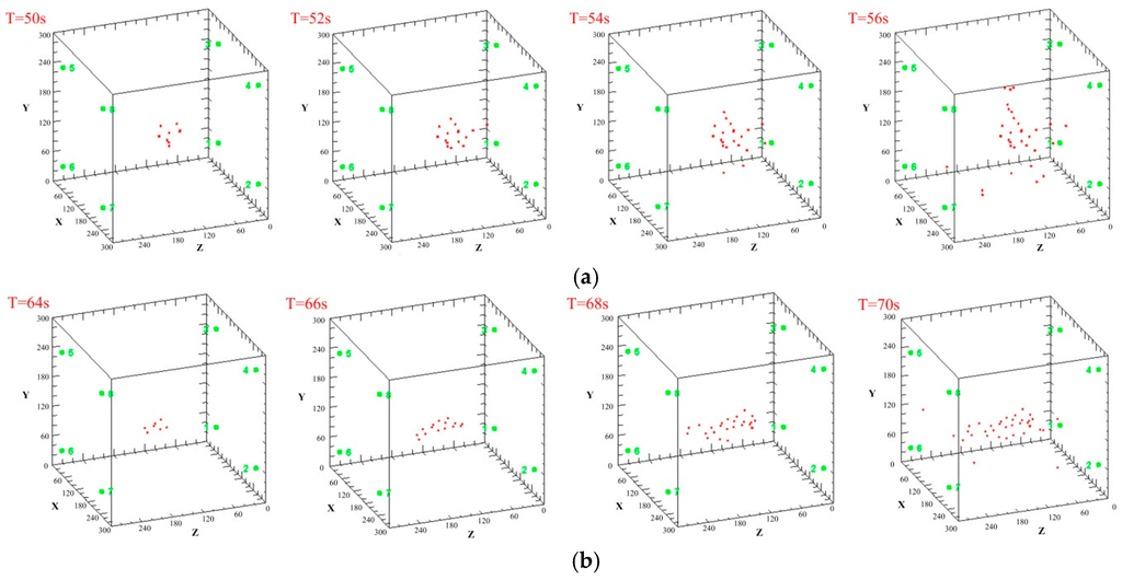 Block diagrams showing acoustic emission event time sequences. The block diagrams in (a) represent time progressions during the experimental run from T = 50 s on the left to T = 56 s on the right and (b) from T = 64 s on the left to T = 70 s on the right. Figure 11a shows events for a samples with = 20°, β = 30°, and the locations of the AE events indicate that the fractures initiated in the coal seam. Figure 11b shows a sample with = 20°, β = 90°, and for this sample the fractures initiated in the coal-rock interface. The green numbered dots are the locations of the AE sensors.