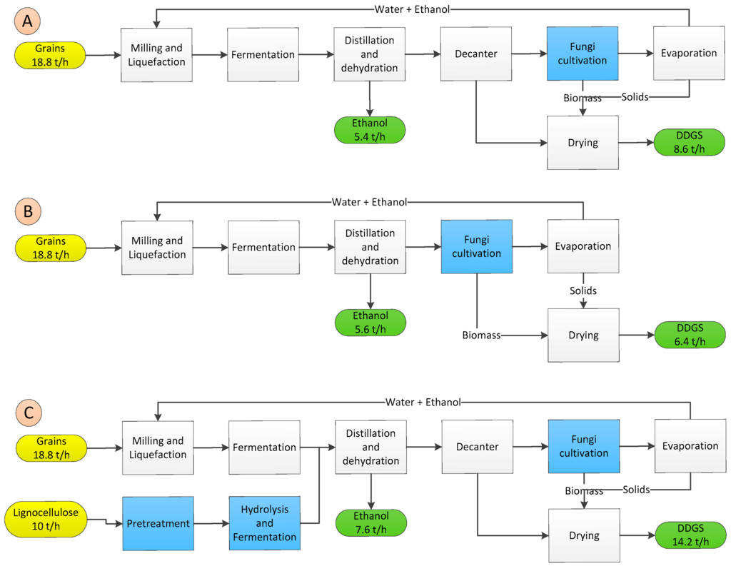 In the base case, after distillation, the leftovers, referred to as whole-stillage were sent through a decanter to remove the solids. This supernatant stream, called thin stillage, entered the evaporation process, while the solid cake was sent to the dryer to obtain the distiller’s grains byproduct. The thin stillage was then evaporated to recycle the water back to the process. The Total Solids (TS) concentration of the thin stillage was about 10%, with a total stream flow rate of 40 t/h, which was obtained after processing 150,400 tons of grains annually. In the modified process, the thin stillage was sent through a fungal cultivation process, where it was converted into ethanol and biomass [28]. The biomass was separated and dried as a fungal animal feed, while the ethanol produced flowed through the evaporator and was recycled back to the process, for further purification. Figure 1 shows the block flow diagram of all the modifications considered in this study, and scenario A shows the thin stillage modified process in the first generation ethanol production.