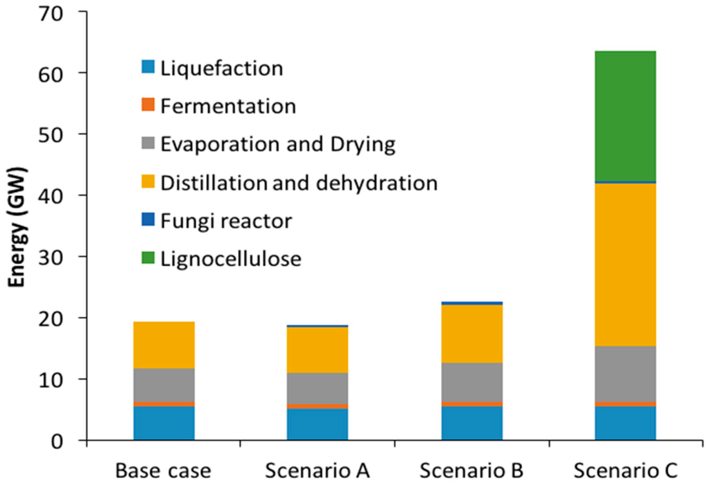 Thin stillage modification had better energy and economic consequences, compared to the whole-stillage modification. Therefore, the integration of the lignocelluloses, i.e., wheat bran using phosphoric acid pretreatment, was examined on the optimized thin stillage modification process. Lignocelluloses with a flow rate of 10 t/h were integrated to the thin stillage modified first generation ethanol processes. The lignocelluloses integration processes consumed 33% of the total energy, which was 63.4 GW (Figure 3, Scenario C). From 10 t/h wheat bran, 2.1 t/h ethanol was obtained in addition to the ethanol from the first generation and the thin stillage modification.