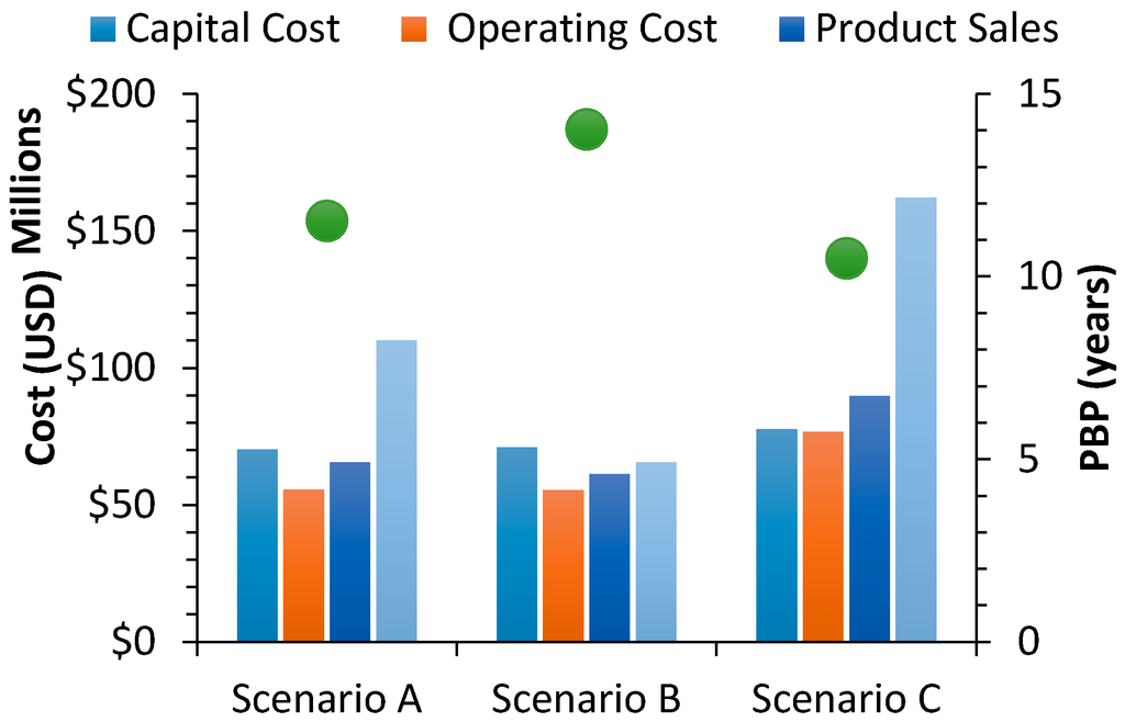 A sensitivity analysis was carried out on the different percentages of lignocellulose integration to the first generation ethanol production. The percentages of lignocellulose integration were altered from 50% to 200% for scenario C. The sensitivity analysis revealed the impact of integrating a greater amount of lignocelluloses to the existing ethanol production facility. In the base case, 10 t/h lignocelluloses were integrated to the modified first generation ethanol production. The different techno-economic parameters such as capital investment, PBP, operating cost, and product sales were estimated for the different sensitivities. Figure 6 shows the cash flow diagram and the different economical evaluations considered for the sensitivity analysis. The results showed that there was no significant difference between the payback for the sensitivities, as the payback for all the scenarios was between 10.2 and 10.7 years.