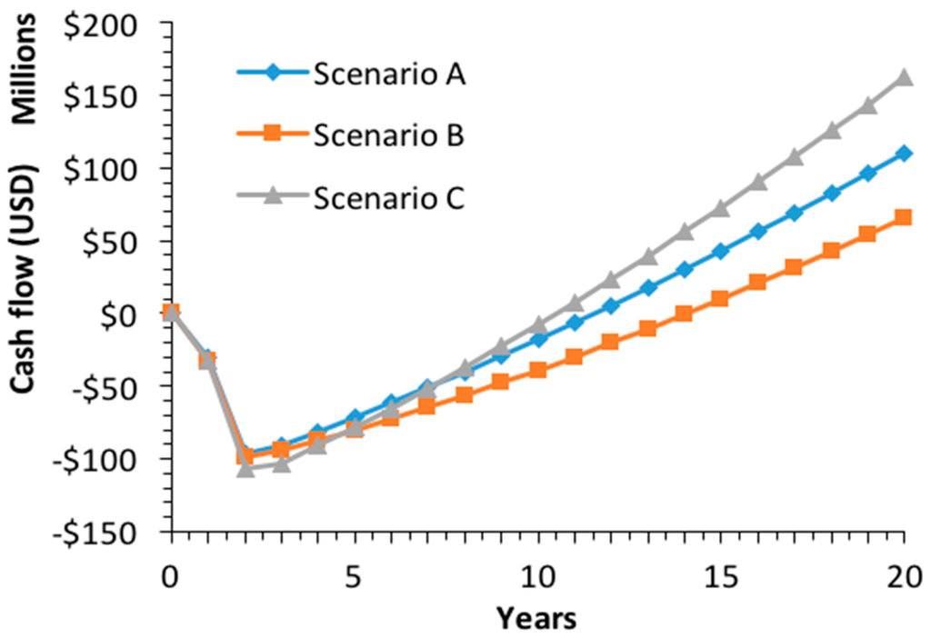 Cash flow diagram for the different scenarios.