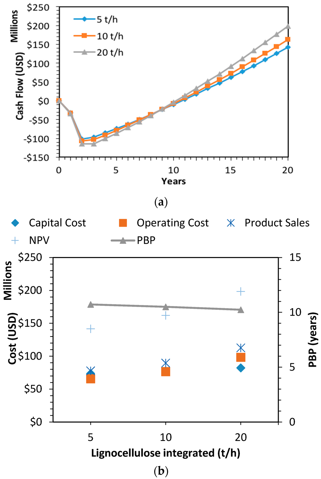Cash flow diagram (a) and economic indexes (b) for the sensitivity analysis.