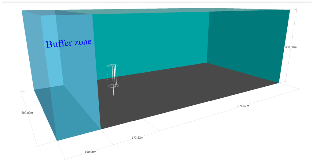 The buffer zone occupies about 12% of the domain length. The domain dimensions are m (=24D), m (=12D) and m (=8D) in the streamwise, spanwise and vertical directions, respectively. The blockage ratio of the turbine in the computational domain is 2.08%, which is well below the value of 10%, which is reported by Chen and Liou [29] as the threshold below which it is acceptable to neglect the blockage effect. Regarding the computational mesh, the number of grid points in each of the three directions is , and . The code has been shown to yield grid-independent results provided that a minimum number of grid points is used to resolve the rotor [11]. In this study, we chose a resolution (15 points in each horizontal direction covering the rotor area) that falls within the grid-independent range. The time resolution for all of the simulations is 0.0155 s. For the wake study simulation, the total physical time of the simulation is 90.4 min, and for mean velocity and turbulence statistics results, we have time-averaged the quantities in question over the final 77.5-min time span.