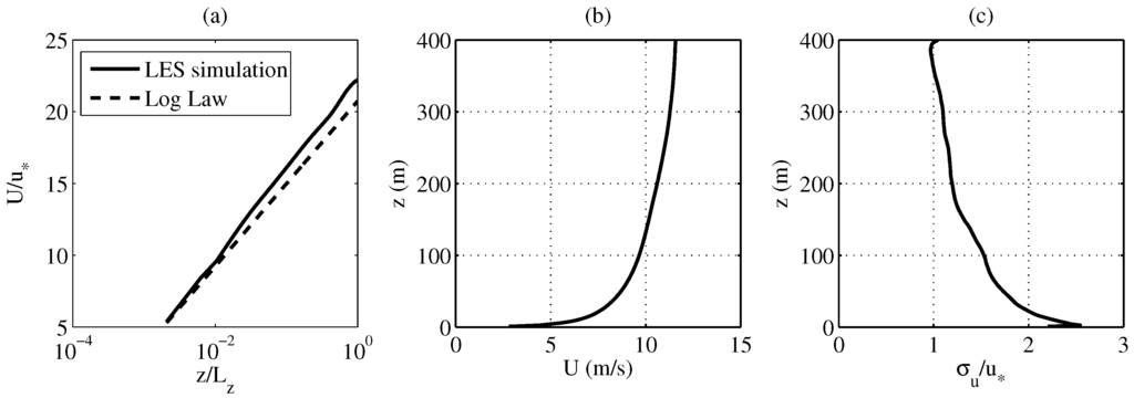 Inflow characteristics: (a) vertical profile of the mean streamwise velocity compared to a log-law profile (horizontal axis in logarithmic scale); (b) vertical profile of the mean streamwise velocity (linear scale); (c) vertical profile of the standard deviation of the streamwise velocity.