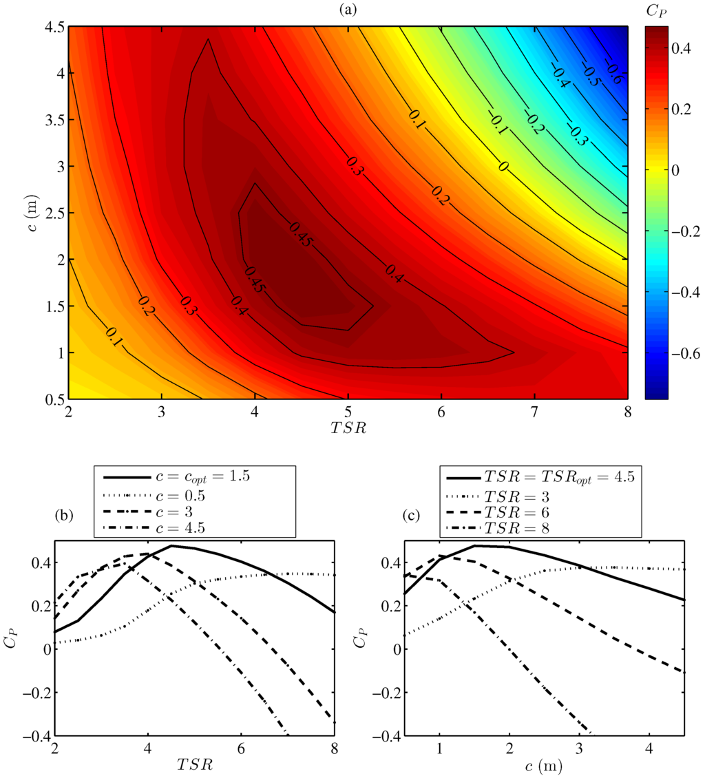 Variation of the power coefficient of a three-bladed VAWT with tip-speed ratio () and chord length: (a) as a function of both and chord length; (b) as a function of for four different chord lengths; (c) as a function of chord length for four different values.