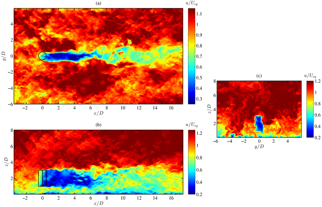 Contour plots of the instantaneous normalized streamwise velocity () in three different planes: (a) the x-y plane at the equator height of the turbine; (b) the x-z plane going through the center of the turbine; (c) the y-z plane which is 2D downstream of the center of the turbine.