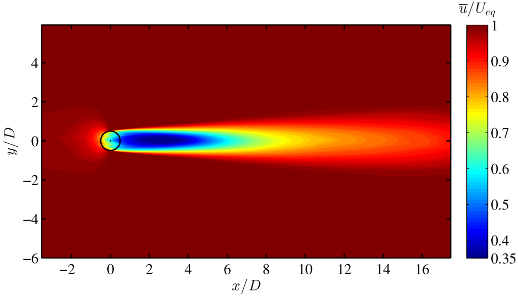 Figure 6 and Figure 7 show contour plots of the mean streamwise velocity in the x-y plane at the equator height of the turbine and in the x-z mid-plane of the turbine. It can be seen in these figures that it takes a long distance for the wake to recover; at a downwind distance as large as 14 rotor diameters, the wake center velocity reaches only 85% of the incoming velocity. Moreover, Figure 8 shows the mean velocity contours in six y-z planes downstream of the turbine. In all of these figures (Figure 6, Figure 7 and Figure 8), one can observe how the wake recovers in the streamwise direction (after a certain distance) and how it expands in the spanwise direction as it advances farther downstream.