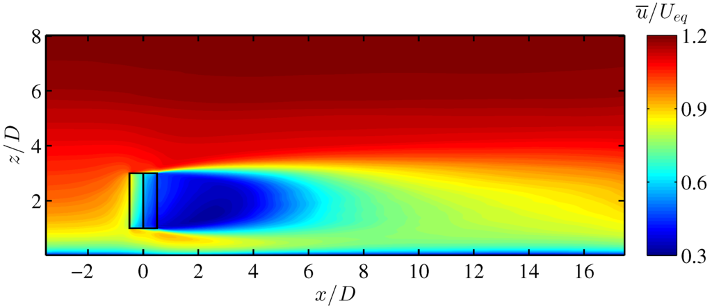 Contours of the normalized mean streamwise velocity () in the x-z plane going through the center of the turbine.